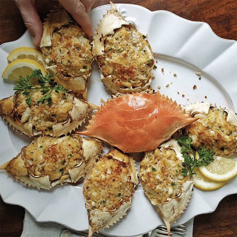 Using a 1/3-cup measure as a mold, pack the crab mixture into 10 portions, then either press the patties into cleaned crab shells or turn out onto a greased baking sheet if you intend to make crab cakes. Arrange the filled crab shells, if using, on a baking sheet. Top each portion with a sprinkling of the remaining 1/4 cup bread crumbs. Cut the remaining two tablespoons of butter into 10 thin pats and set on top of each portion of crab.