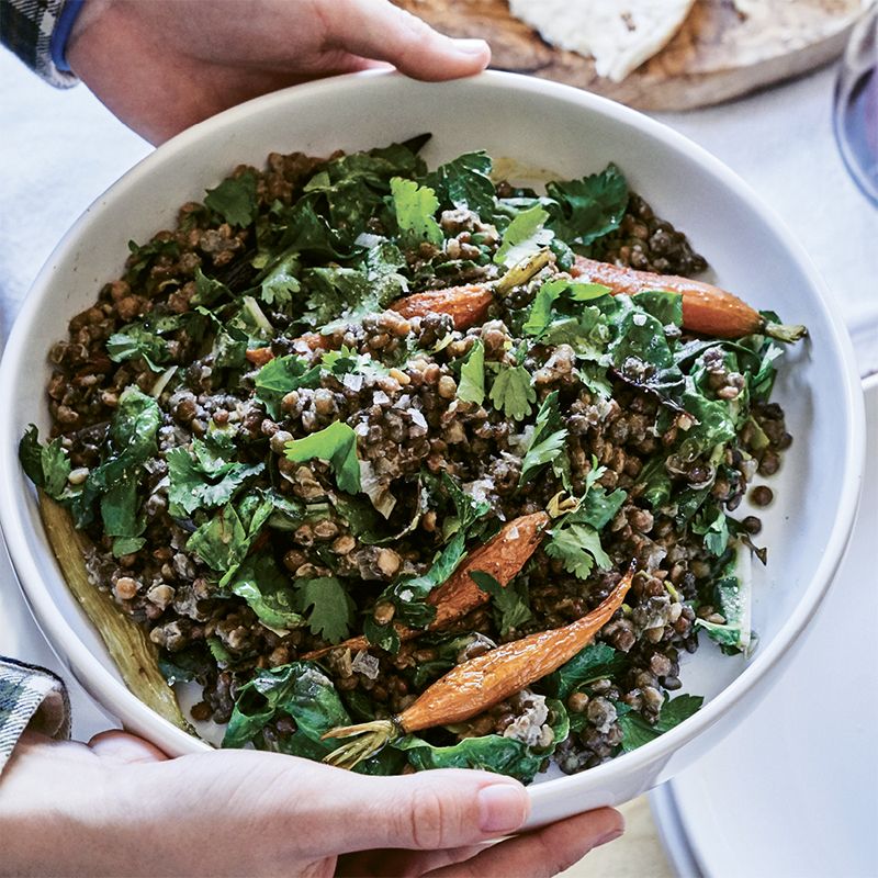 Heat the remaining tablespoon of olive oil in a large skillet over medium-high heat. Add leeks and sauté until translucent, three to four minutes. Add rainbow chard and continue to sauté until the chard is just wilted. Add the cooked lentils, carrots, and herbs and coat with the vinaigrette. Stir until ingredients are combined and warm. Season the top with salt and pepper, garnish with fresh herbs, and serve hot.