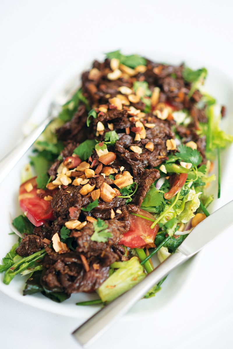 Divide the salad among four bowls. Top with wok-seared beef and garnish with peanuts and cilantro leaves.