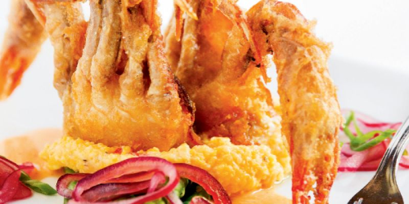 Crispy Buttermilk Soft-Shell Crab with Asparagus, Pickled Red Onion, Pimiento-Cheese Grits, & Roasted Tomato Butter