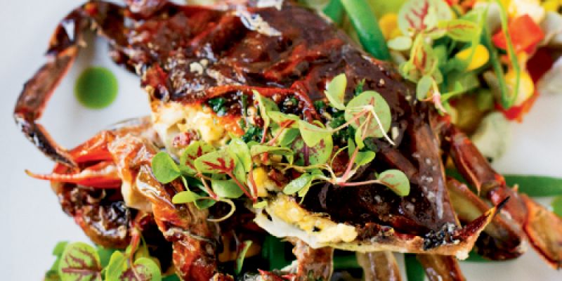 Grilled Soft-Shell Crabs with Summer Field Peas, Sweet Corn Succotash, & Pecan-Parsley Pesto