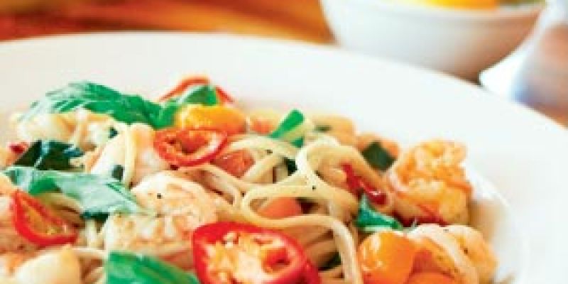 Linguine with Coastal Carolina Shrimp, Peppers, Yellow Tomato, Lemon, & Basil