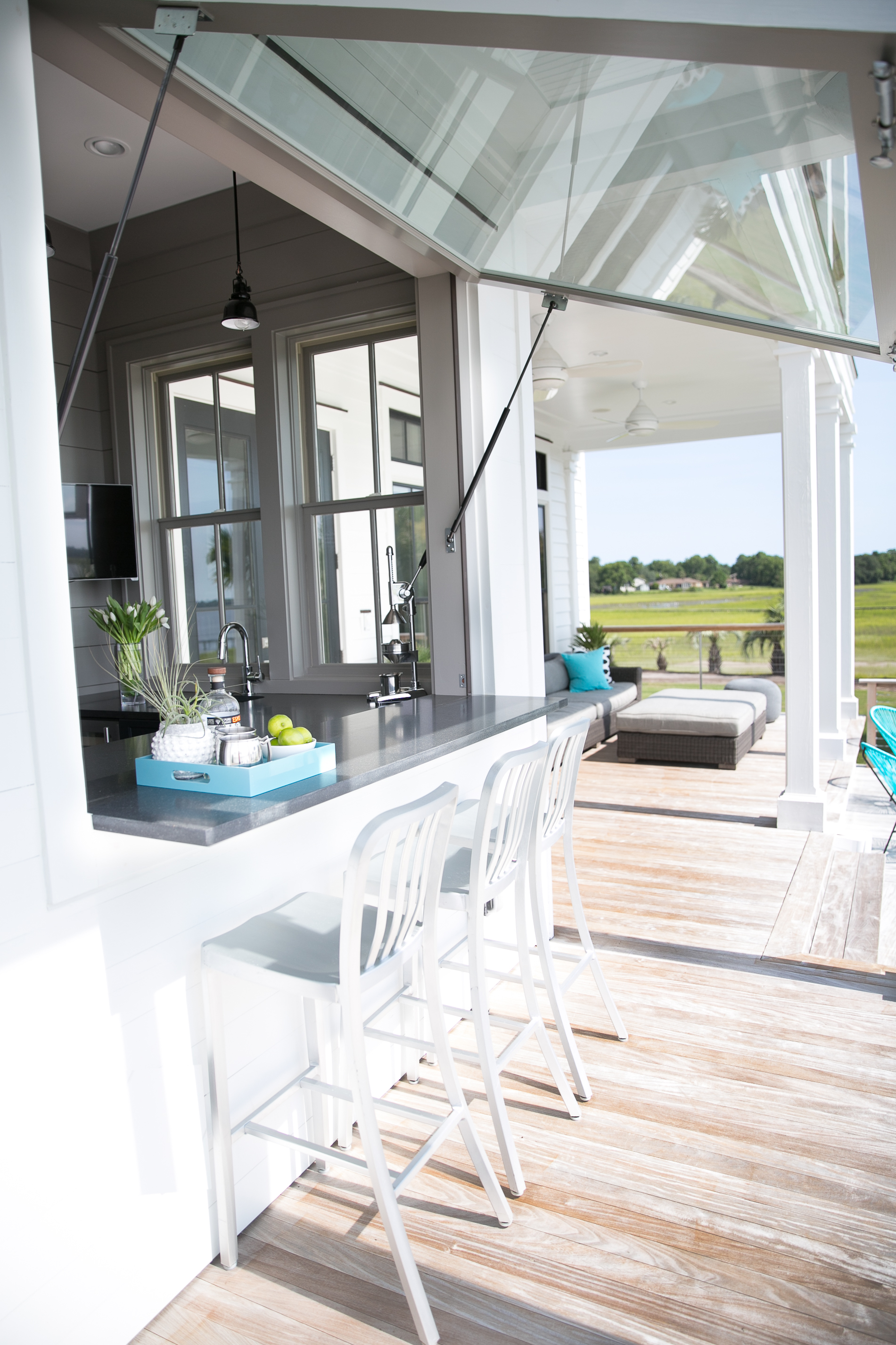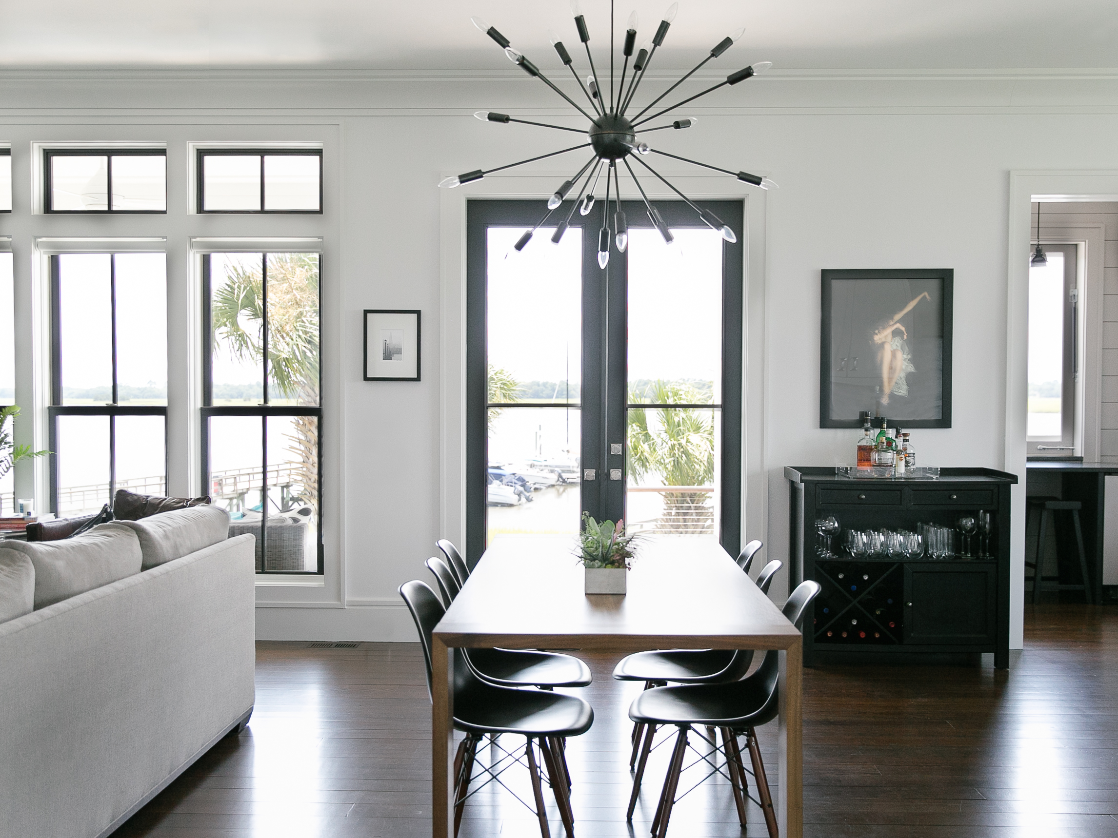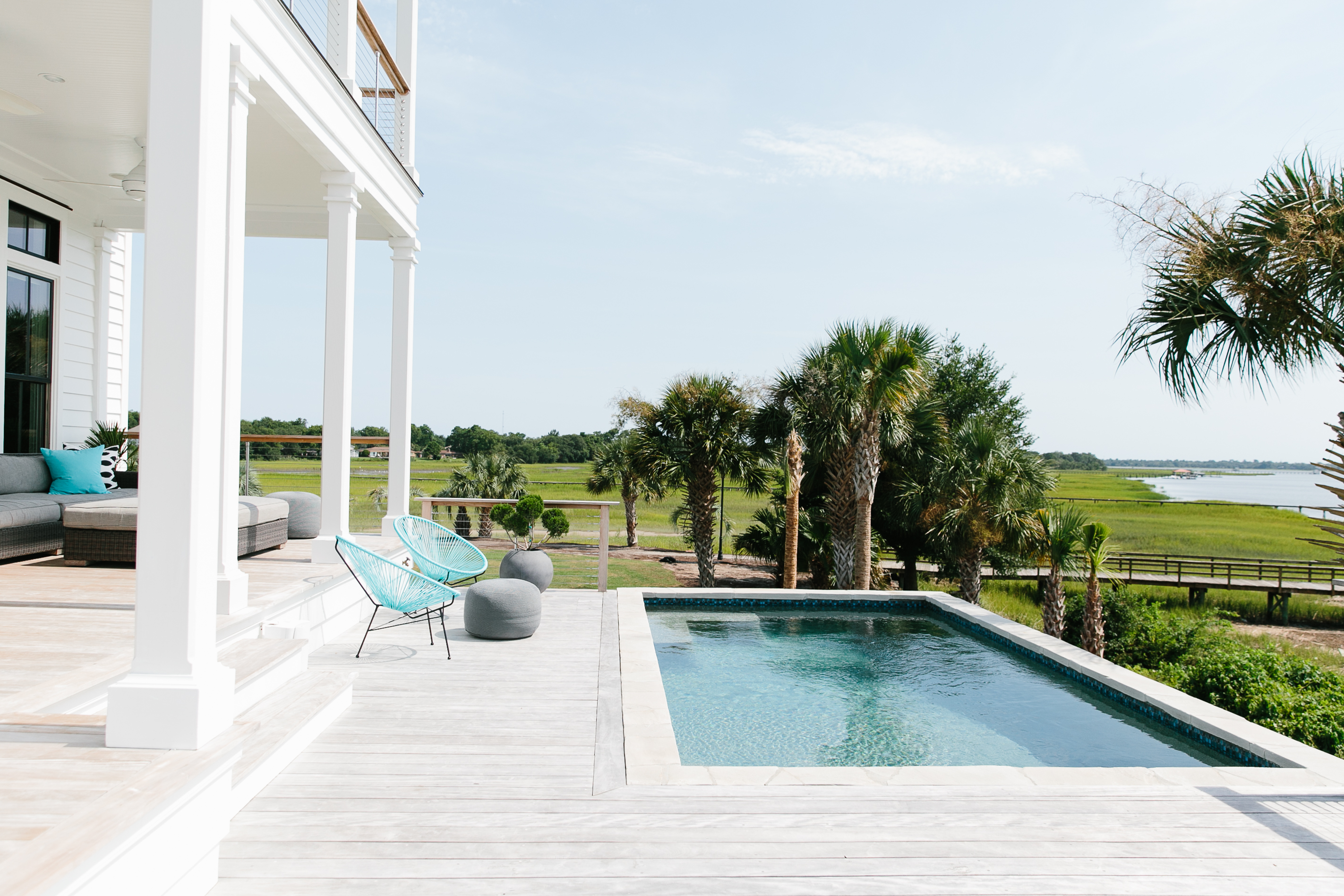 Walking through the entry hall of Melissa Lenox and Brad Davis’s Lowndes Pointe home is like fast-forwarding through a highlight reel of the couple’s history. Along the corridor, under a pitched beadboard ceiling, an artful grouping of framed photos hints at the whirlwind romance that swept them across the globe and landed them here, in a modern, coastal abode on the banks of the Ashley River. Their travels are well-documented: one scenic shot, taken by Brad during their first trip together, shows children playing in the street in Cartagena, Colombia. In another snap, the duo stands atop a glacier in snowy Patagonia, gloved hands intertwined and raised triumphantly in the air. Yet another features a graffiti-splashed wall that caught their eyes in Bologna, Italy. All lead to the end of the hall, where glass doors look out over a soothing tableau: palm trees sway in the breeze, the water ebbs and flows, and docked boats rise and fall with the tide.
