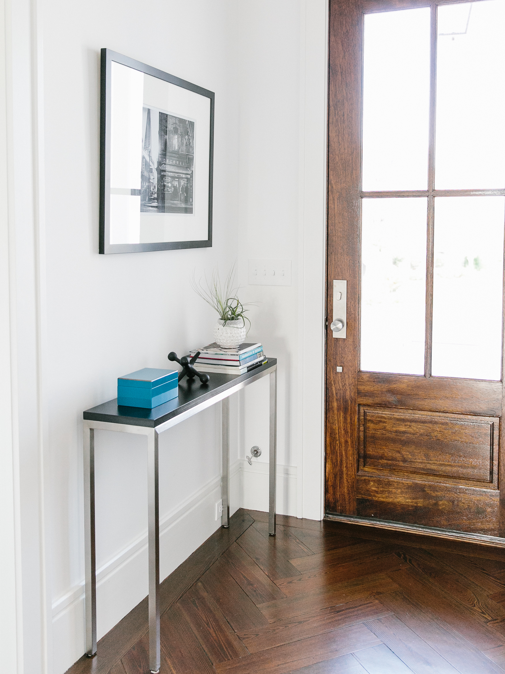 To underscore the abode’s contemporary edge, Cindy Cline of Wertimer + Cline dreamed up a landscape with angular hardscaping, complemented by texturally interesting plantings, such as windmill palm and sweetgrass. But to balance those modern accents, Brad snuck in a nod to the couple’s shared love of history: a gas lantern identical to the one that graced his former home in New Orleans now flickers above the front door. “After years of renovating historic properties, I fell in love with some of the elements that have stood the test of time, like this lantern,” he says. “I love that we were able to incorporate it into our home.”