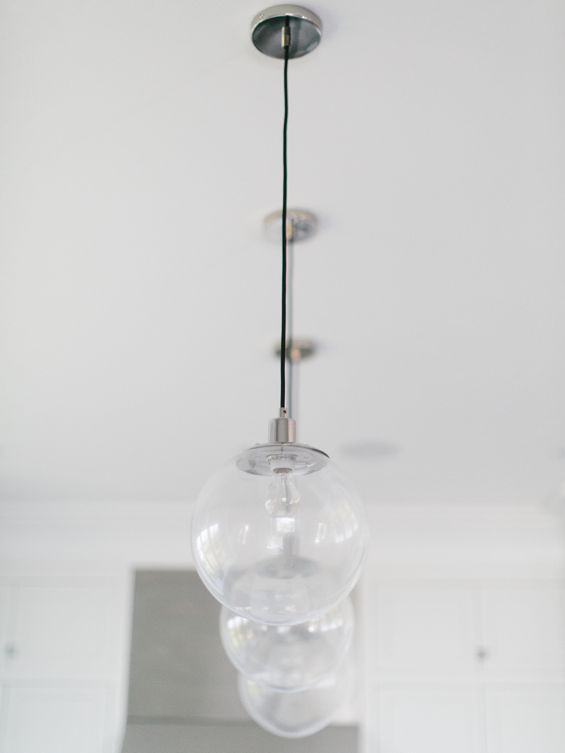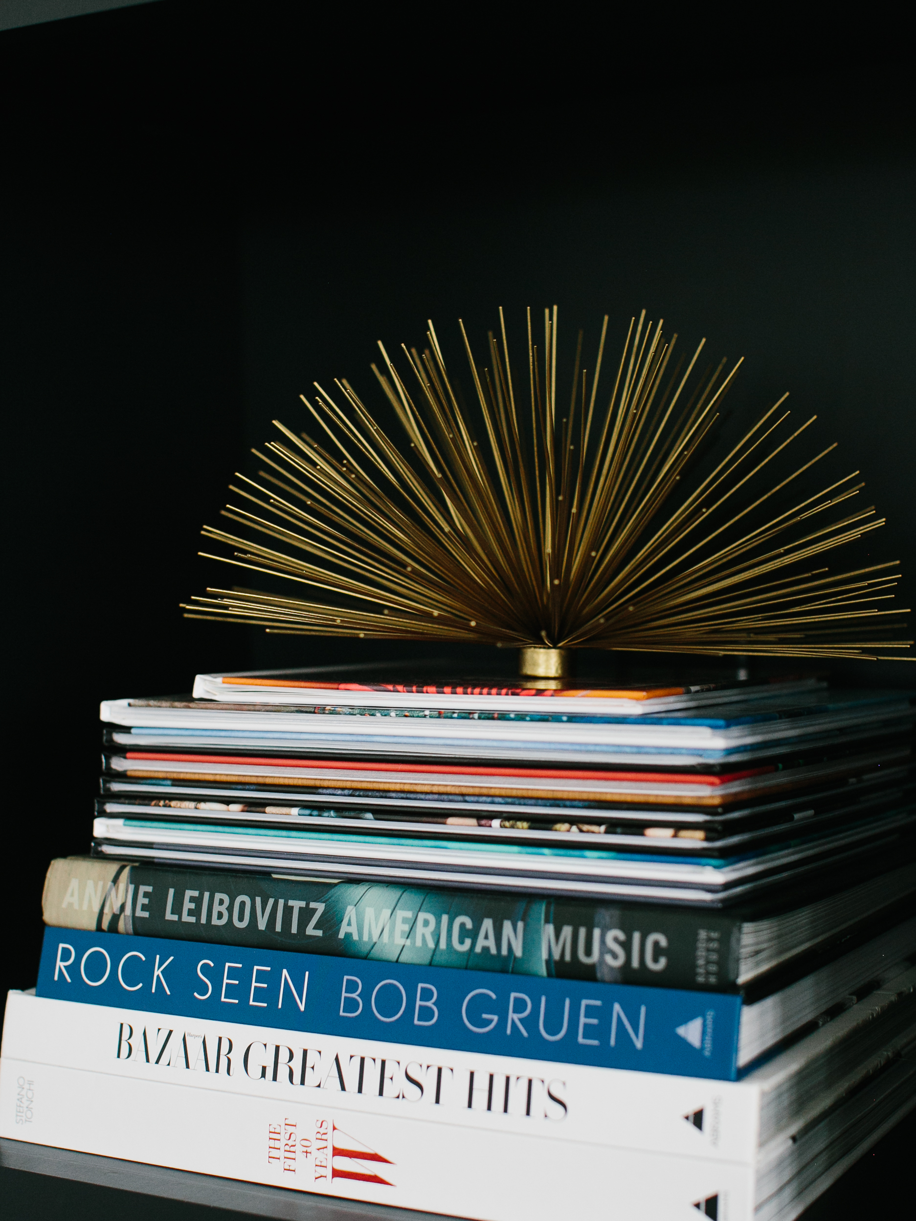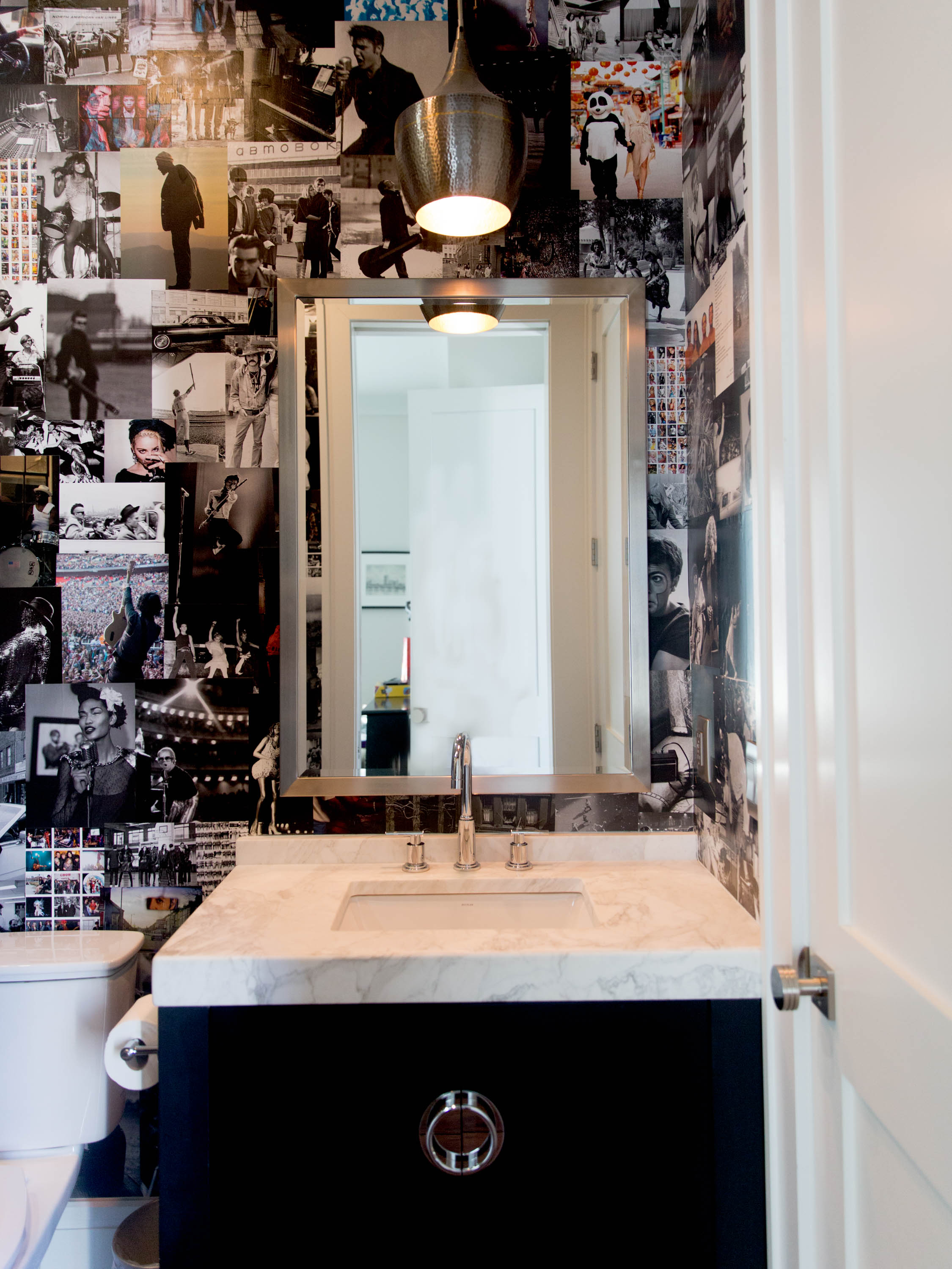 To draw out this motif, she fused mid-century furnishings (“If you want to go retro, mid-century pieces have the cleanest lines,” she says) with picks that have an edgy feel, such as the Banksy-esque painting above the living-room mantel (“It looks like the dark side of corporate America,” she notes), the angular chandelier over the dining table, and the rock-and-roll wallpaper in the first-floor powder room. The wallpaper was a DIY job the couple tackled in one weekend, raiding coffee-table books for images of favorite musicians and gluing them to the wall. “Brad is obsessed with New Orleans jazz musicians, so they’re in there, and I grew up in the ’80s, so Madonna has a presence,” she says. Upstairs, a more intimate personal touch: in a hang space between the twins’ rooms, Melissa placed a grouping of skateboard decks that once belonged to her late brother. “He lived life to the fullest; I like these little reminders of him,” she says.