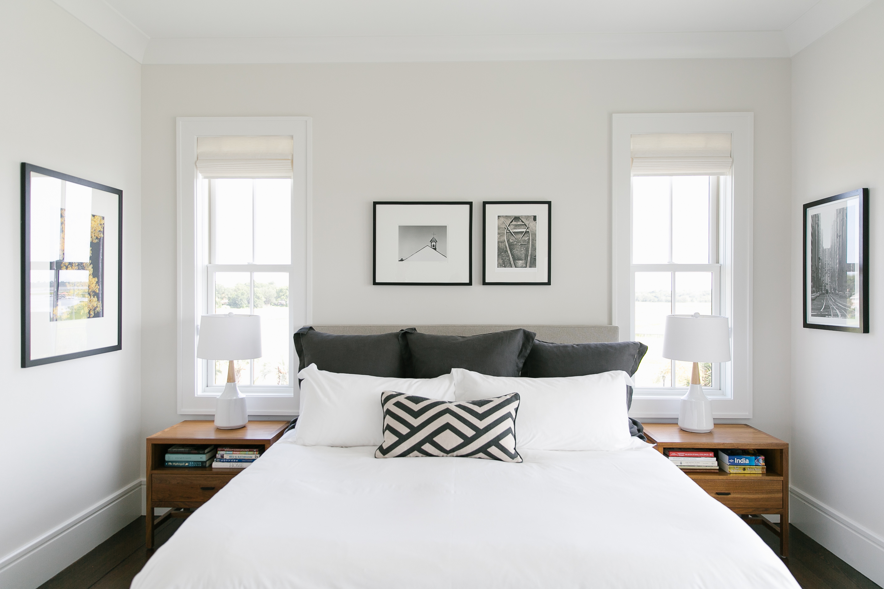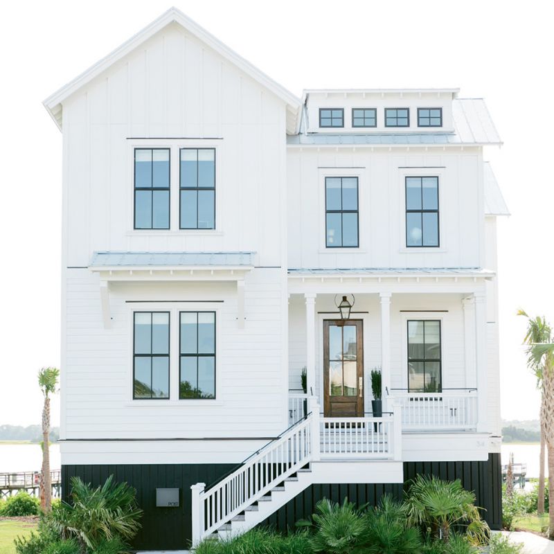 Melissa kicked things off by flexing her design muscles, sketching out her vision for the façade. The results have an undeniably coastal aesthetic. Composed of beachy materials, such as board-and-batten and corrugated tin, the house is elevated to keep high waters at bay. But thanks to a stark black-and-white color palette and shed roofing, it makes a modern statement, too. The mix of old and new creates an aesthetic Clarke refers to as “Lowcountry modern.” “The key is getting the balance, scale, and proportion historically correct, yet stripping away any of the unnecessary adornments,” he says.