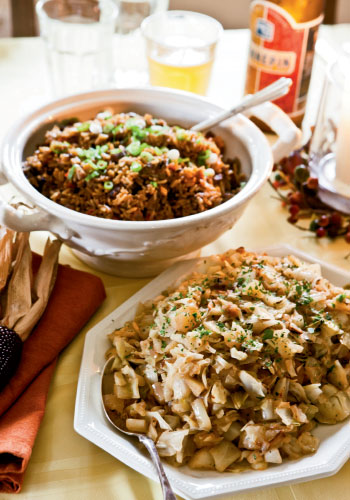 Menu: Appetizers: Crackers with hot pepper jelly and goat cheese, oysters on the half shell Main: Grilled turkey with bacon stuffing Sides: Cabbage and fried apples, dirty rice, creamed mustard greens, sweet potato pone Dessert: Buttermilk pie and carrot cake