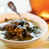 The dirty rice recipe has been passed down from the late Bill Neal, Robert’s renowned boss at Crook’s Corner. As for the mustard greens, Robert dresses them up his favorite way: with salty pork, ample chicken stock, and heavy cream for deep, essential flavor, simmering the greens until they are pillowy soft.