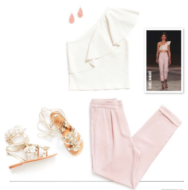Want to bare a little skin while keeping your look sophisticated? This season, it's all about the single sleeve. Isabel Marant paired an ultra-cropped top with a high-waisted pant. Our version veers a little more modest but mimics the pretty palette