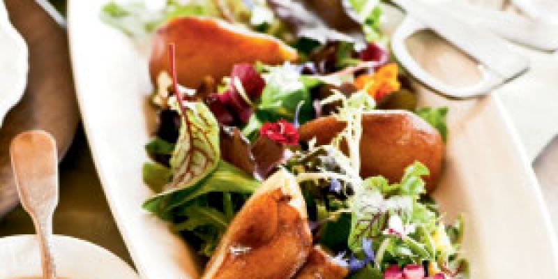 Autumn Lettuces with Balsamic Roasted Pears, Whipped Goat Cheese, & Pecan Vinaigrette
