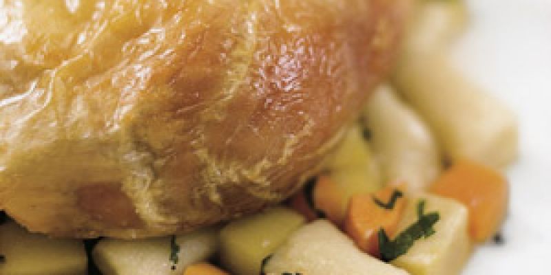 Herb-Brined Roast Chicken with Potato Gnocchi, Root Vegetables, & Chicken Jus