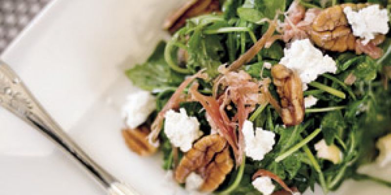 Arugula Salad with Toasted Pecans, Goat Cheese, Prosciutto, & Lemon Dressing